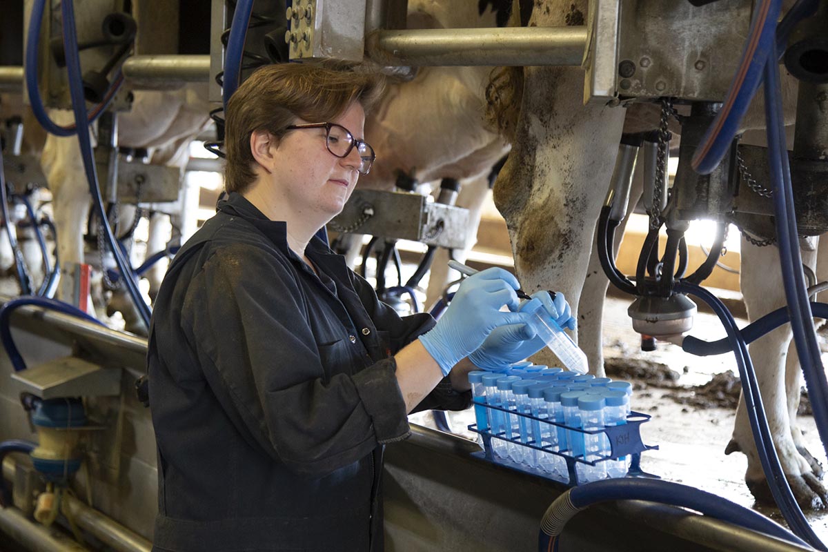 A Master of Professional Studies student takes samples from dairy cows